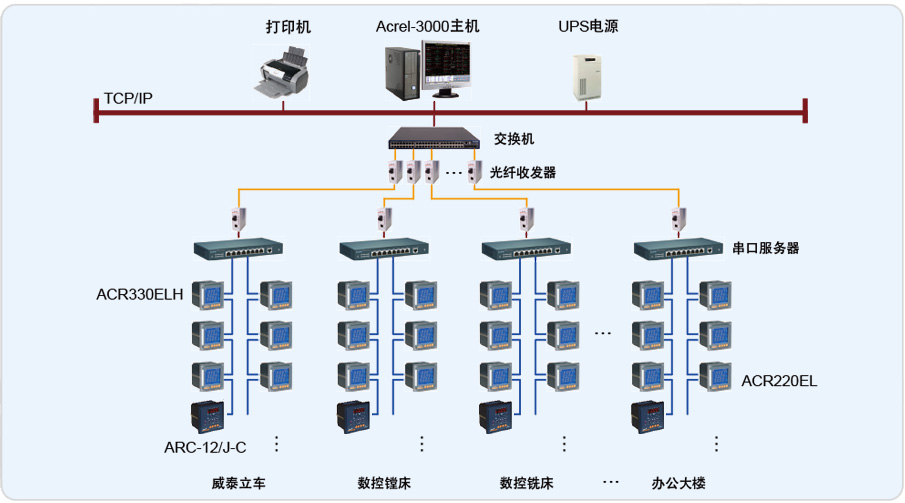 整個(gè)系統(tǒng)采用Acrel-3000型電能管理系統(tǒng),完成了對(duì)威泰立車公司、數(shù)控鏜床公司、數(shù)控銑床公司、武漢善福公司、武重鑄鍛公司、大件加工廠、中小件加工廠、辦公大樓8個(gè)單位13個(gè)配電室各回路的電能監(jiān)測(cè)和管理。其中低壓進(jìn)線回路裝安科瑞ACR330ELH,低壓功率因數(shù)補(bǔ)償回路ARC-12/J-C型功率因數(shù)自動(dòng)補(bǔ)償控制儀,其它回路配置ACR220EL網(wǎng)絡(luò)電力儀表。整個(gè)系統(tǒng)采用網(wǎng)絡(luò)分布式結(jié)構(gòu),監(jiān)控主機(jī)位于10KV監(jiān)控室內(nèi),系統(tǒng)采用開(kāi)放的通訊協(xié)議,通過(guò)現(xiàn)場(chǎng)總線連接到通訊服務(wù)器 NPort5430 。13個(gè)配電室通過(guò)光纖組網(wǎng)與低壓配電系統(tǒng)相連,實(shí)現(xiàn)數(shù)據(jù)通訊功能。