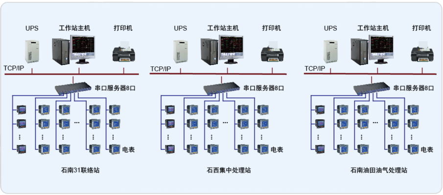 本系統(tǒng)針對以上需要解決的問題,對石南31聯(lián)絡(luò)站、石西集中處理站和石南油田油氣處理站三個(gè)站進(jìn)行能耗管理系統(tǒng)改造,其中石南31聯(lián)絡(luò)站配置儀表78塊,石西集中處理站配置儀表35塊,石南油田油氣處理站配置儀表59塊,進(jìn)線回路采用ACR320ELH多功能顯示儀表,出線回路采用PZ72-E4/KC,每個(gè)站為單獨(dú)一套系統(tǒng)。系統(tǒng)采用分層分布式結(jié)構(gòu),監(jiān)測數(shù)據(jù)采集完成后上傳傳至各自站內(nèi)監(jiān)控值班監(jiān)控室。