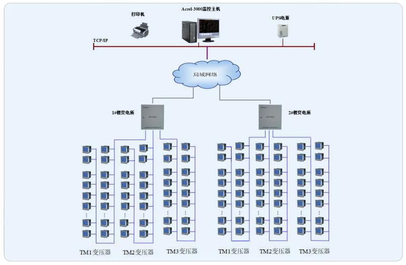 本項目共有176個PZ80L-E4/KC、14個PZ96L-E4/KC多功能電力儀表。值班室位于1#樓配電室旁,放置一臺Nport5630-16串口服務器。場儀表經485總線連接值串口服務器的任務,串口服務器由現場的以太網絡將數據傳輸至監控主機上。本監控系統采用分層分布式結構,即站控層,通訊層與間隔層。